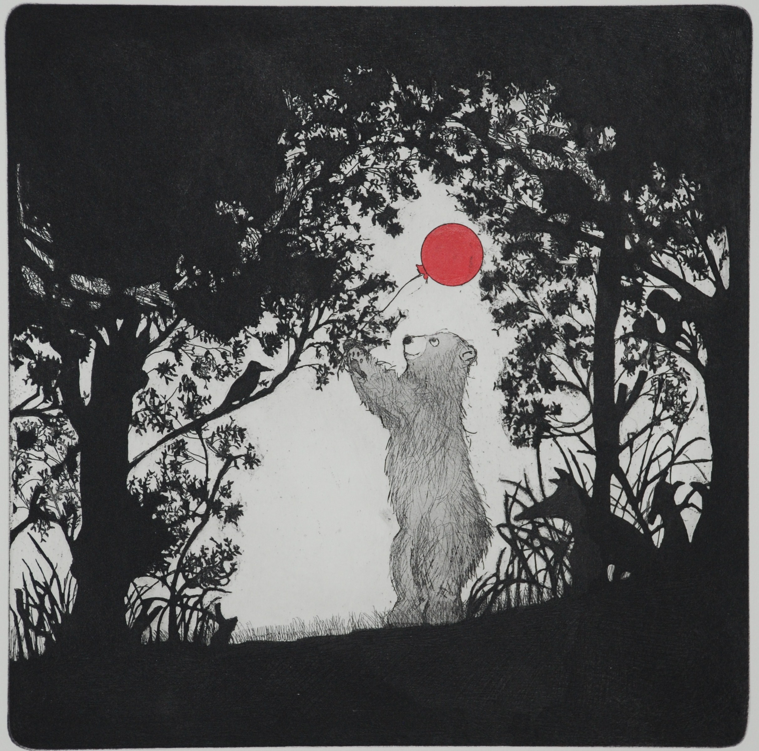 Japanese artist Katsuko Ono have previously created etchings for children’s books, something evident in her playful work reminiscent of shadow theatre. Although there is a slight sinister feeling in the darkness of the background where creatures and dangers seem to be lurking. Her work are glimpses into a bigger, mythical story and it sparks the imagination of the viewer, transporting us into Ono’s fairytale world.