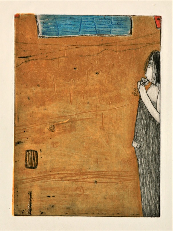 Woman is part of a 3 pieces series, all done with handcolored aquatinte combined with woodcut, when living and working in Beijing, China from 2005 to 2009. Here Heike Arndt established one of the very few existing studios with a custommade press. Here she experimented with paintings,sculptures and also with graphic. She produced in her chinese studio from 2005-2009 several graphic works. The series “Home sweet home” 12 different pieces, “Luggage” with 8 different pieces and the 3 pieces “Boy”, “Woman” and “Girl with red lamp”. Even when the most editions have been signed with a maximum edition of 40 pieces are most of them not be printet more than typical 10. All of them varie a bit in color as Heike preferes the slight difference to keep each one with there own identity.