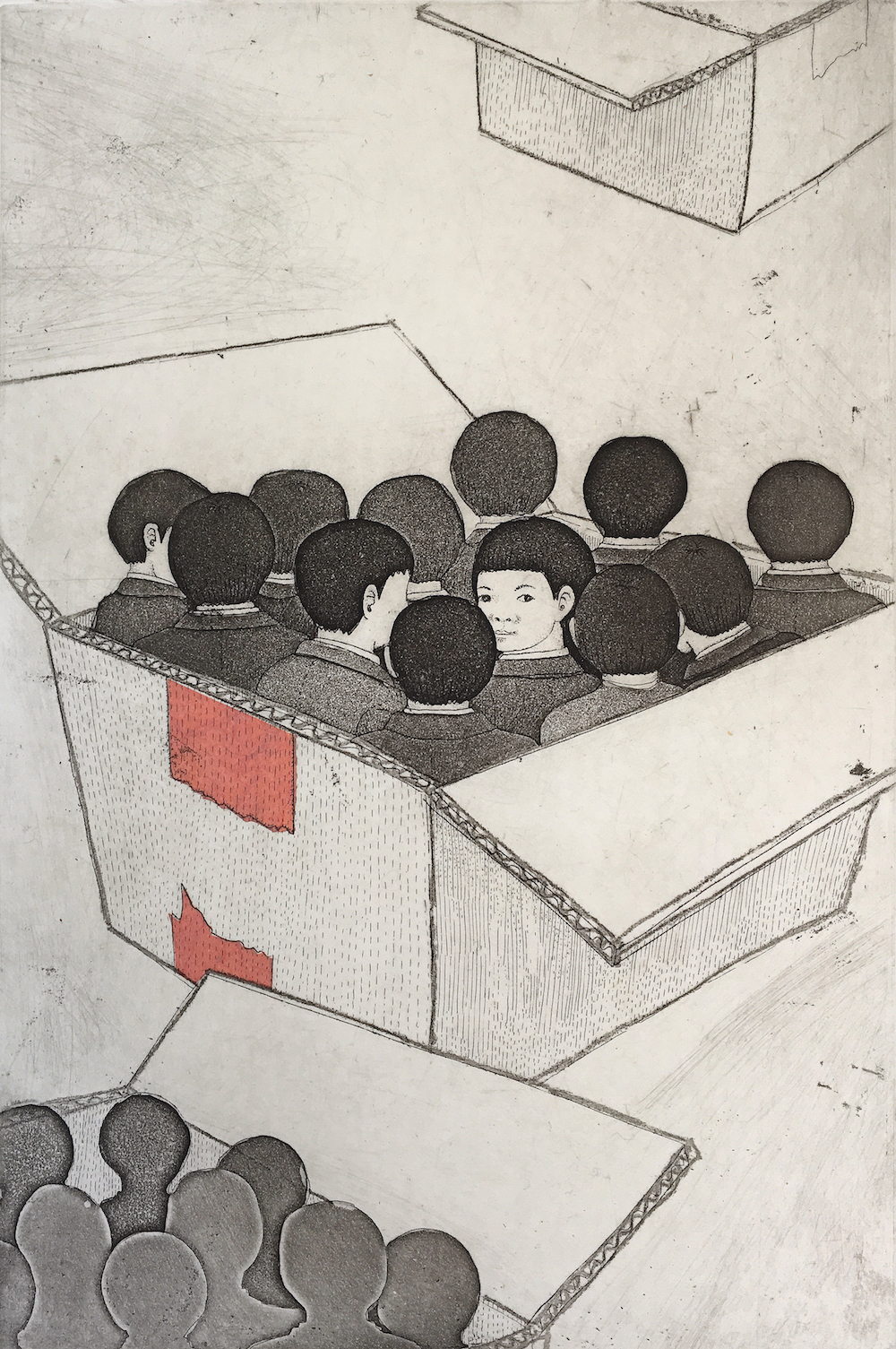 Sohee Kim’s etchings and chine-collés depict surrealistic and absurd scenes using everyday settings and objects. The precise details in the pictures combined with these invented episodes are both fascinating and disturbing. They will trigger the viewer’s curiosity.