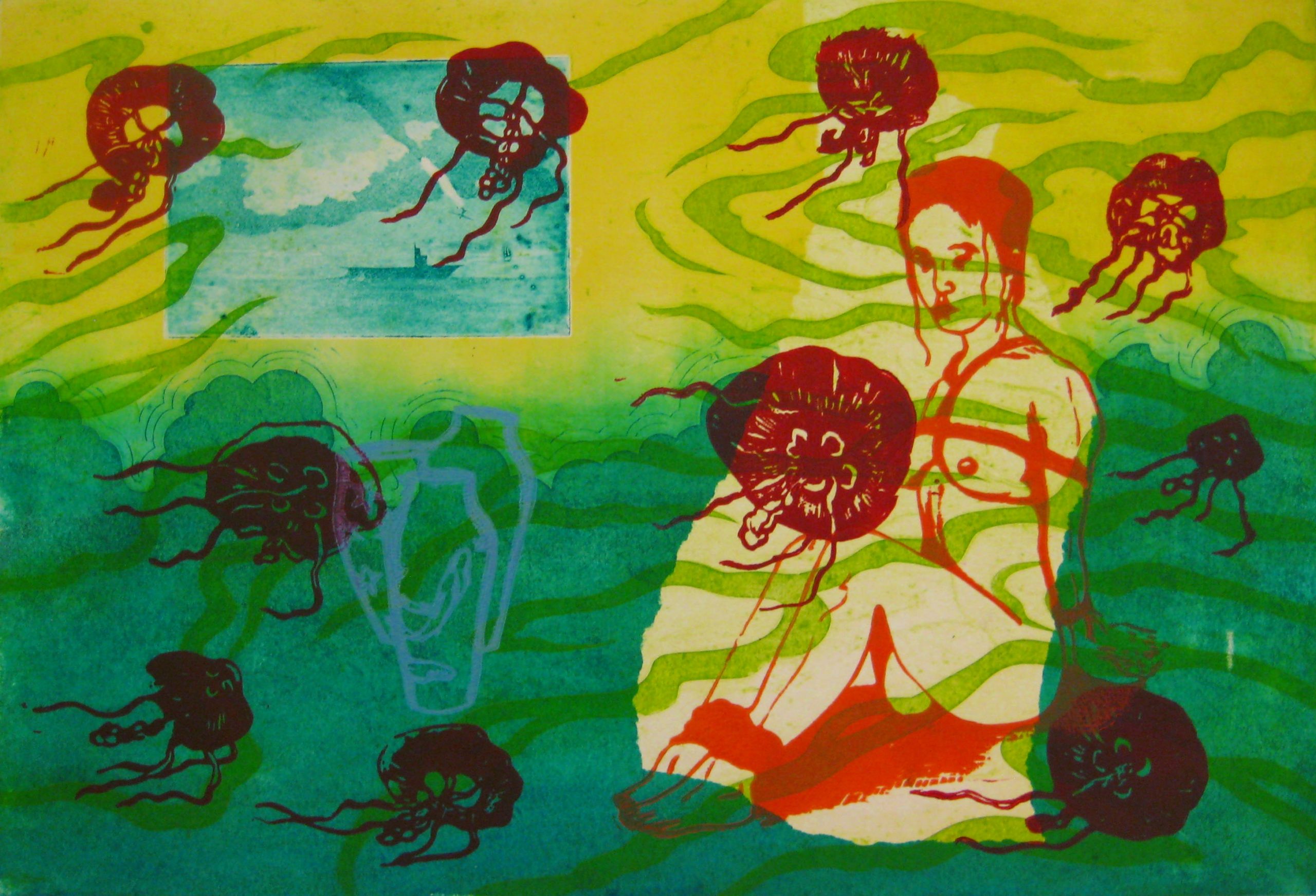 Hardy Ernst creates colorful screen prints on paper dramatically illustrating the sea and or his travels.These prints almost abstract expressionist landscape get the viewers attention with their explosiveness.