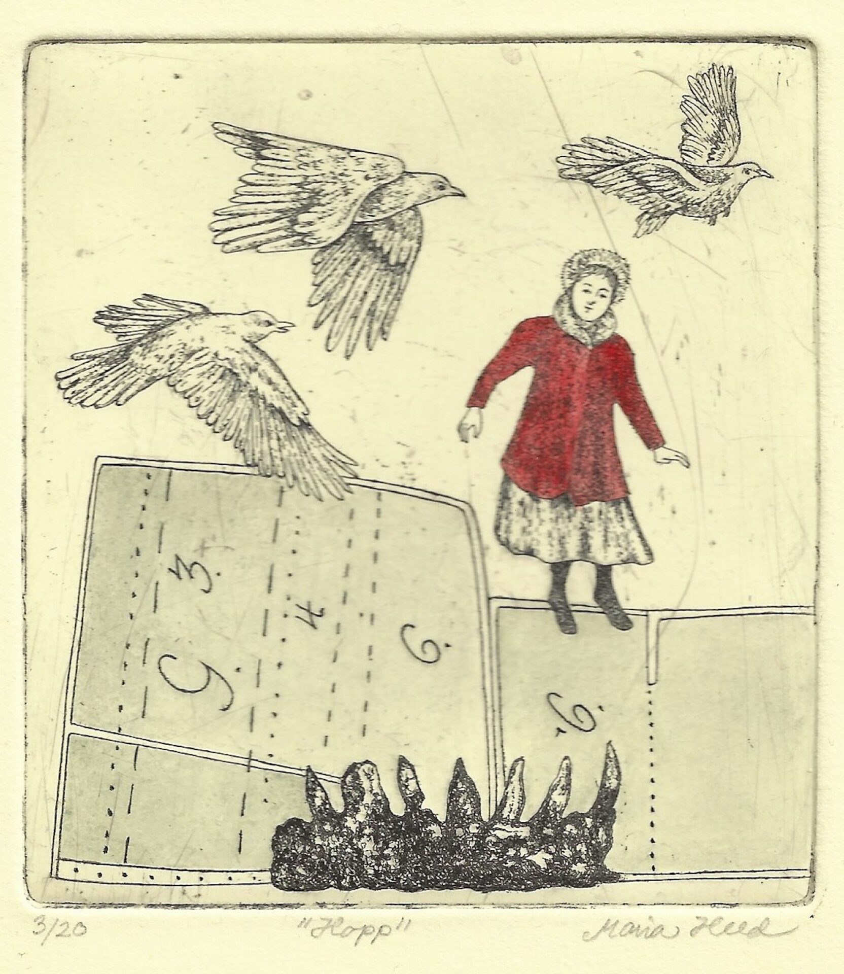 Swedish artist Maria Heed’s figurative etchings explore the interrelation of figurative subjects and a supportive background. The subject matter depicted with an almost naive approach invites the viewer to unravel its narrative.