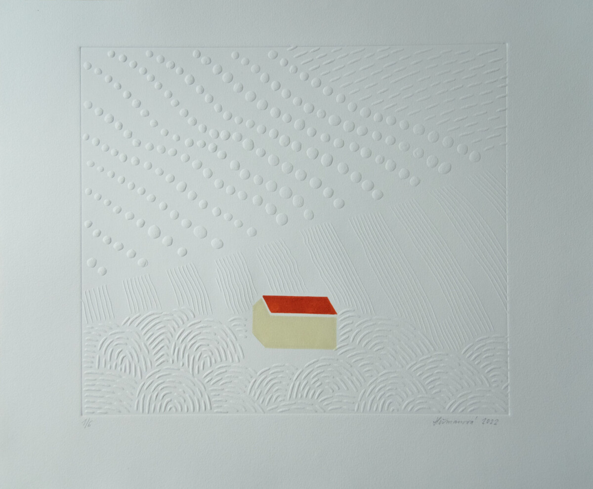 Hermanova combines vibrant coloured objects with subtle textural embossing in her linocuts to form minimalist landscapes. Geometric shapes are supported by the ever-changing background that shifts with light and shadow.